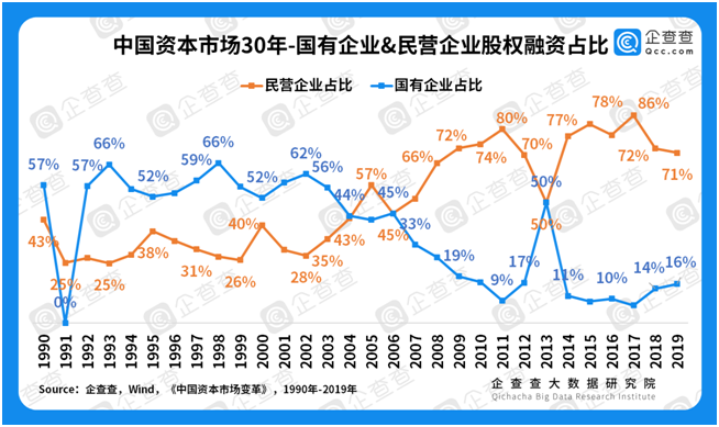民营企业不断壮大。我国资本市场曾长期服务于国企融资、改革、转型的需求,先后助力97年国企股份制改革、05年股份分置改革及14年以来的混合所有制改革。通览中国资本市场30年的融资构成,企查查发现,2004年以前,国有企业融资占比均在50%以上,2006年之后,国有企业融资占比一路走低,从之前的50%降至10%左右。与此同时,民营经济崛起,占比最高达80%左右。国企、民企的发展如同两条此起彼伏、互相交织的曲线,一方面,国企的融资需求逐渐减少;另一方面随着国家经济增长进入到新旧动能转换期,以民营企业为主的新兴产业发展寻求巨大的资金支持。