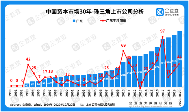 区域经济大变迁——珠三角、长三角增长曲线相近。由于珠三角拥有广州、深圳两大一线城市,因此也让广东毫无悬念地成为了上市企业最多的省份。企查查数据显示,广东省30年来的上市公司新增量分别在1993年(42家)、2010年(69家)与2017年(97家)经历了三次增长高峰。
