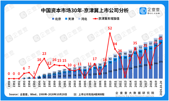 区域经济大变迁——京津冀上市公司年增量波动最大。企查查数据显示,京津冀地区出现了1997年(23家)、2010年(52家)两个高峰。在2013年低谷期之后的6年,数据呈现出奇数年较高、偶数年较低的波动状态。