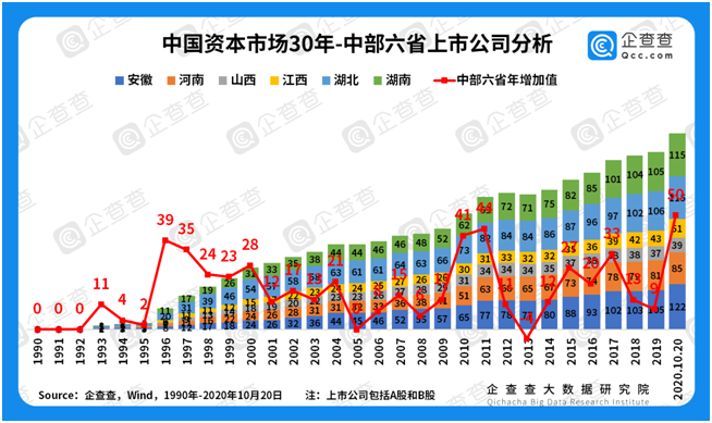 区域经济大变迁——中部六省“两个驼峰”曲线。中部六省随紧邻东南沿海地区,但六个省份的上市公司总数(498家)尚不敌广东一省(639家)。从30年变化趋势来看,出现了“两个驼峰”,第一个峰值在1996-2000年,第二个峰值在2010-2011年。从六省之间的比较分析来看,安徽、湖南、湖北上市公司数量接近,均为100多家,其次是河南、江西,山西上市公司数量最少。