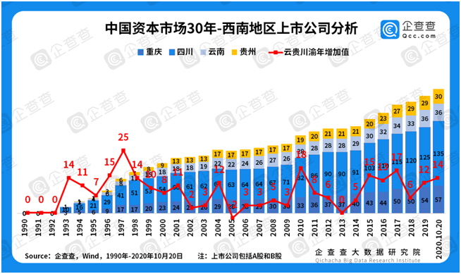 区域经济大变迁——西南地区平稳增长。相比于长三角等经济发达地区,西南地区的上市公司数量整体偏低,但随着区域经济模式的转型升级,上市企业近年来也保持着较平稳的增长率。企查查数据显示,上世纪90年代云贵川渝四省份经历过两次增长高峰,1993年、1997年分别增长14家、25家。2000-2009年这十年间,云贵川渝四省上市公司增加了48家,而2010-2019年增加了100家,两个十年中环比增长了108%。