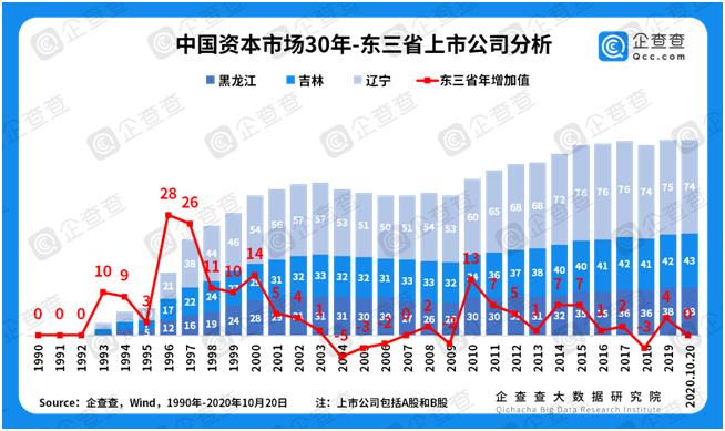 区域经济大变迁——东三省缓慢“衰退”。回顾中国资本市场30年,东三省的“衰退”是难以回避的话题。企查查数据显示,东三省上市公司曾在1993-1994年、1996-1997年出现过两次增长高峰。彼时,东三省受益于传统重工业的产业优势,迎来一波又一波上市潮。但进入新世纪后,东三省年增量在2004-2006年期间连续出现三年的负增长,之后又在2009年、2018年出现两次负值。1990-1999年这十年间,东三省上市企业共新增97家,但在2000-2019年这二十年间,上市企业仅新增60家。在中国经济整体保持高增长率的大背景下,这样的“反差”尤为引人深思。