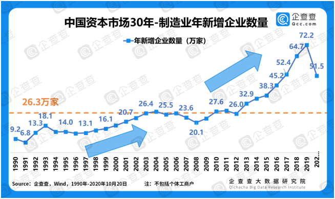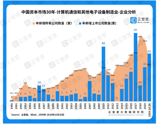 中国制造业不仅覆盖范围广,更在关键领域储备了大量后备军。聚焦于计算机、通信和其他电子设备制造业,企查查数据显示,1990年计算机、通信和其他电子设备制造业仅有1家上市公司、2111家公司,但是截至2020年10月,该行业已有409家上市公司、31万家公司。也就是说,过去30年,平均每年新增上市公司12家,平均每年新增公司10127家!一个拥有31万家企业作为后备军的计算机、通信和其他电子设备制造业,未来势必能孵化出更多的上市公司,创造出千帆竞发的壮观。