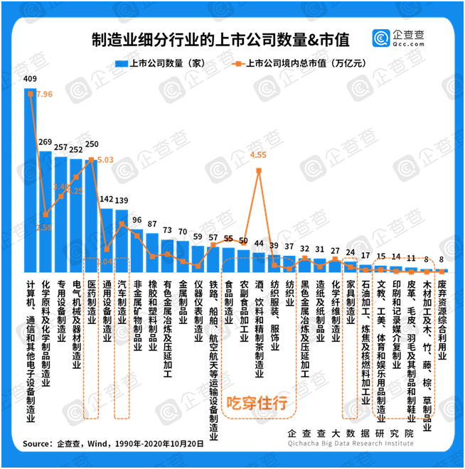 中国制造业不仅有总量,覆盖领域亦很广。在制造业31个细分领域中,计算机、通信和其他电子设备制造业以409家上市公司、7.96万亿元的总市值位列第一,大名鼎鼎的“芯片”行业就位于此。此外,有近一半制造业细分领域与“吃穿住行”密切相关,例如医药制造业总市值5.03万亿,酒、饮料和精制茶制造业总市值4.55万亿,分别排名市值榜单的第二、三位。不管是与民生密切相关的制造业,还是事关“民族底气”的制造业,我国两手抓、都很硬。