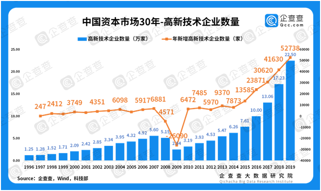 我国是进击中的科技大国。1991年,国务院批准全国26个高新技术产业开发区为国家高新技术产业开发区。同年,国家科委发布《国家高新技术产业开发区高新技术企业认定条件和办法》,开启了我国高新技术企业认证之路。我国的这场科技突围赛,早在30年前打响,这与我国资本市场的组建节点惊人的一致。企查查数据显示,我国平均每年新增高新技术企业9000多家;根据科技部发布的数据,截至2019年底,全国高新技术企业达到22.5万家。