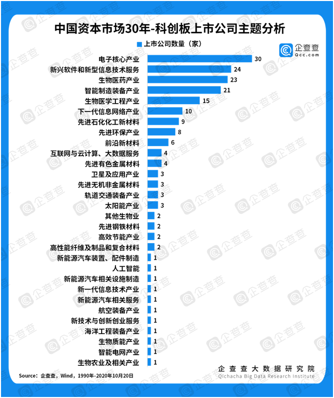 “中国芯”相关上市公司成科创板最火“网红”。企查查数据显示,截至2020年6月,科创板共有上市公司185家。从上市主题来看,电子核心产业、新兴软件和新型信息技术服务、生物医学产业拥有最多数量的上市公司,分别是30家、24家和23家。值得一提的是,在30家电子核心企业中,与芯片制造相关的企业高达15家。2020年7月,中芯国际、寒武纪先后登陆科创板,前者(中芯国际)一跃成为科创板市值最高的上市公司,后者(寒武纪)有“AI芯片第一股“之称。