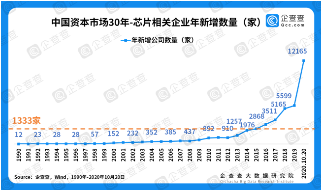 政策利好助力芯片行业迎来春天。2020年8月4日,国务院发布《关于印发新时期促进集成电路产业和软件产业高质量发展若干政策的通知》,宣布符合条件的企业将免征企业所得税10年。国家政策的大力扶持,势必推动芯片行业迎来春天。企查查数据显示,过去30年我国平均每年新增芯片相关企业1333家,截至2020年10月,共有芯片企业4.9万家。从上世纪90年代,每年仅新增几十家芯片企业,到近10年,增速越来越快,增加值越来越大,今年到目前新增注册量1.2万家。企查查大数据研究院预测,政策的助力将推动芯片行业本就十分陡峭的增长曲线将更加陡峭,该行业将展现出指数级增长的潜力。