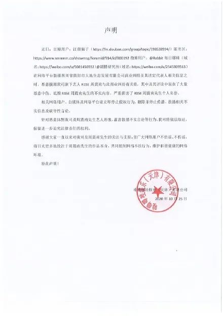随后,周震南所在的经纪公司哇唧唧哇态度强硬地发表声明,称相关网友散播信息时,恶意揣测旗下艺人周震南与此商业纠纷有关联,其中及其评论中混杂了大量恶意中伤、诋毁的不实内容,严重损害了周震南个人名誉。要求相关网络用户、自媒体及网络平台立即停止侵权行为,删除并停止传播、数据相关不实信息及误导性言论,强调公司将依法取证保留进一步追究法律责任的权利。