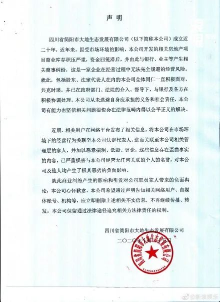 热议之下,周震南父亲的公司四川省简阳市大地生态发展有限公司也坐不住了。其称受市场环境影响,公司资金回笼之后产生相关商事纠纷,但已在与各方积极协调处理:“本公司有能力也坚信相关问题很快会在法律范畴内得以公平正义的解决。”声明还表示,网友将公司关联至管理层家人,并恶意揣测、诋毁、评论,已损害与公司经营无关联的个人的名誉,将保留通过法律途径追究相关方法律责任的权利。