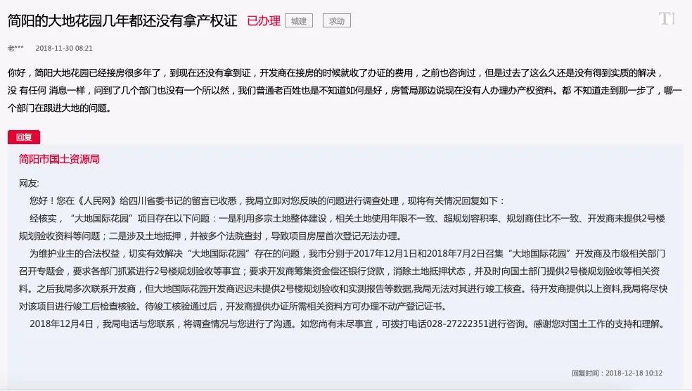 《国际金融报》记者查询简阳市领导留言板发现,2018年曾有业主就大地国际花园的产证问题进行问询。简阳市国土资源局回复称,大地国际花园项目存在以下问题:一是利用多宗土地整体建设,相关土地使用年限不一致、超规划容积率、规划商住比不一致、开发商未提供2号楼规划验收资料等问题;二是涉及土地抵押,并被多个法院查封,导致项目房屋首次登记无法办理。