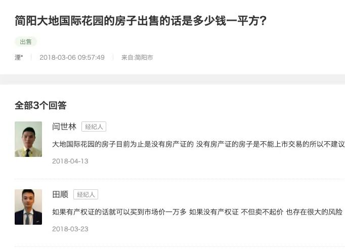 在简阳市的安居客问答上,有业主询问大地国际花园房源的出售情况,回复的几个经纪人都提到产证问题,他们指出大地国际花园的房源目前为止没有房产证,无法挂牌交易。没有产证不仅让大地国家花园的房源卖不上价,也为交易带来很多风险。上海中原首席分析师卢文曦补充道,项目未来还存在烂尾的风险,此外也牵涉税费问题,“即便后期产证办理下来,几年的耽误导致后期交易时也可能存在时间不够而税费过高。如果业主急需用钱,当前房源无法抵押也不能交易,业主被套其中很被动”。