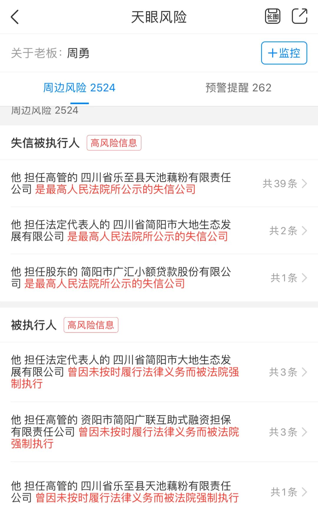 《国际金融报》记者在天眼查查到,仅周勇名下的大地生态便存在679条法律诉讼,392条历史被执行人信息。周勇本人更是存在2524条周边风险,预警提醒262条。早在2017年,周勇便因其未办理涉案房屋的国有土地使用权证和房屋所有权证就上了失信人名单,截至目前,其共有失信被执行人信息42条,履行情况均为:全部未履行。
