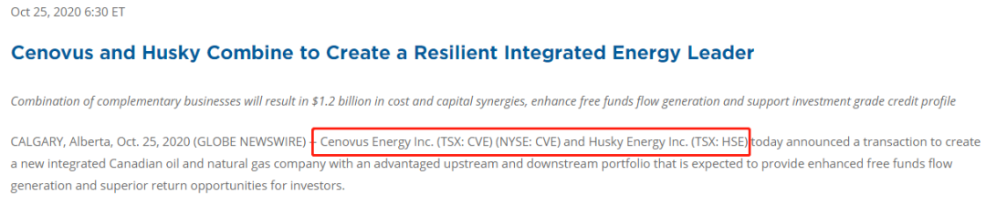 当地时间10月25日,赫斯基能源宣布,加拿大油砂生产商Cenovus Energy与赫斯基能源公司同意以全股票方式进行合并。合并后的公司将以Cenovus Energy Inc.的名义运营。此次收购的总价值为236亿加元(约合180美元)。