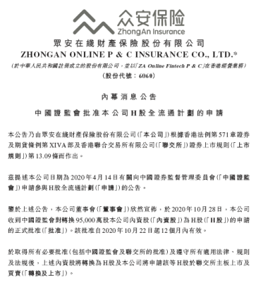 众安在线10月28日公布,公司收到中国证监会对转换9.5亿股众安在线内资股为H股申请的正式批准。该批准自2020年10月22日起12个月内有效。