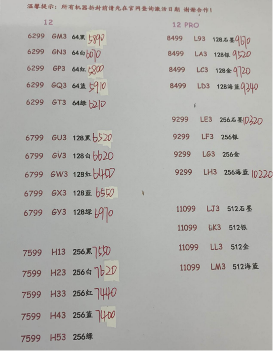 从华强北商家的报价单来看,无论是行货还是水货,iPhone12大部分机型都已跌到了官网价格以下,降价幅度最高的是64G红色版本,最便宜的报价比官网价格足足便宜了520元,现场商家表示,64G和128G版本的iPhone12降价幅度最大。