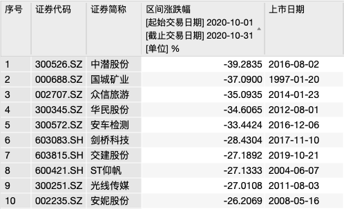 堪称“2020年最妖股票”、本月被证监会立案调查的中潜股份,成为10月最“熊”的A股,本月下跌39.28%。