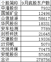 截至9月底,这十只个股股东户数合计达到27.87万户,最多的光线传媒、众信旅游和安妮股份,分别达7万户、5.86万户和5.7万户。