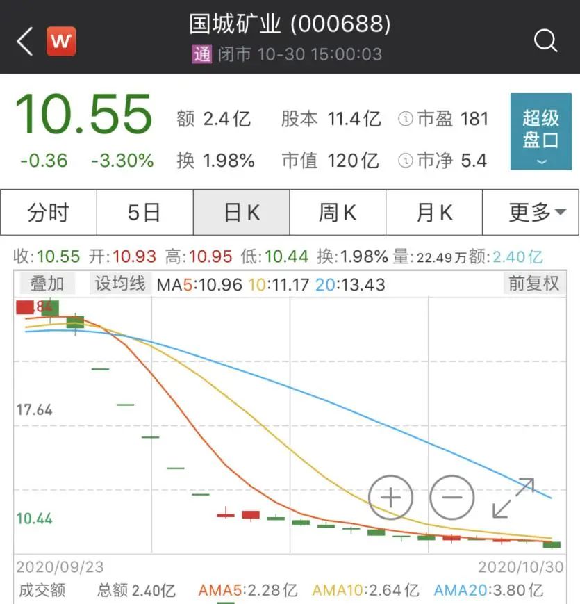 在连续四个一字跌停后,10月12日,又有消息曝出其第一大股东及其一致行动人质押8亿股,国城矿业再次走出一字跌停。