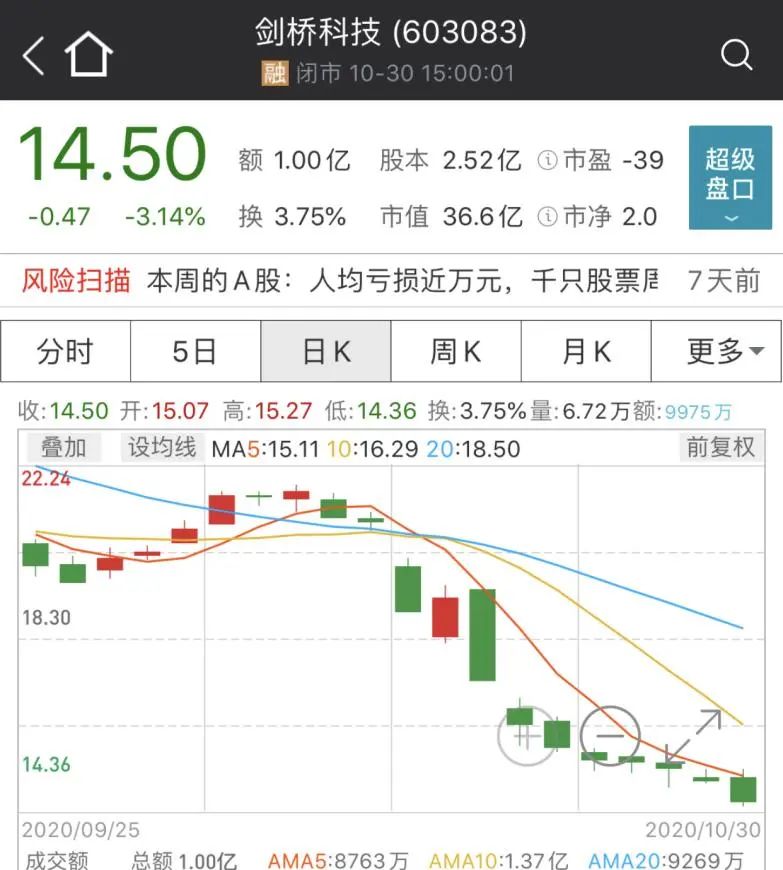 依靠5G概念,股价从2019年初到今年7月,接近涨了3倍,不过期间多名股东抛出减持披露计划,今年7月创下34.11元/股的历史巅峰之后,剑桥科技在5G热点减弱、股东减持、业绩走差等多因素共振下,股价告别了强势,陷入了持续下行。