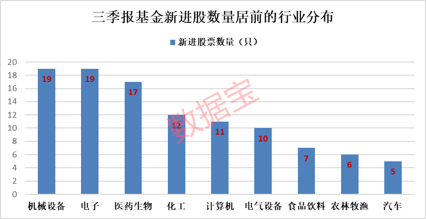 与二季度末的基金持股数量相比,有140只股在第三季度获得基金新进持仓。分行业来看,机械设备和电子行业的新进股数量居多。