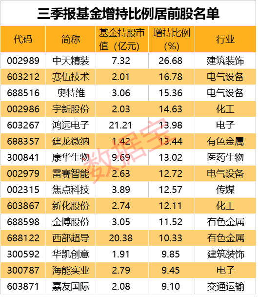 有12只股的增持比例超10%。其中中天精装的增持幅度最大,该股在二季度末的基金持股比例仅达到6.55%,三季度末的持股比例增长到33.23%,目前有13家基金持有该股。根据公司披露的三季报显示,公司前三季度归属母净利润1.56亿元,同比增长7.38%,营业收入18.54亿元,同比增长19.15%。公司第三季度新签订单金额合计约4.43亿元,此外,公司住宅装修业务已中标尚未签约订单金额约为9.64亿元。中天精装的股东户数已经连续13期下降,筹码连续集中。