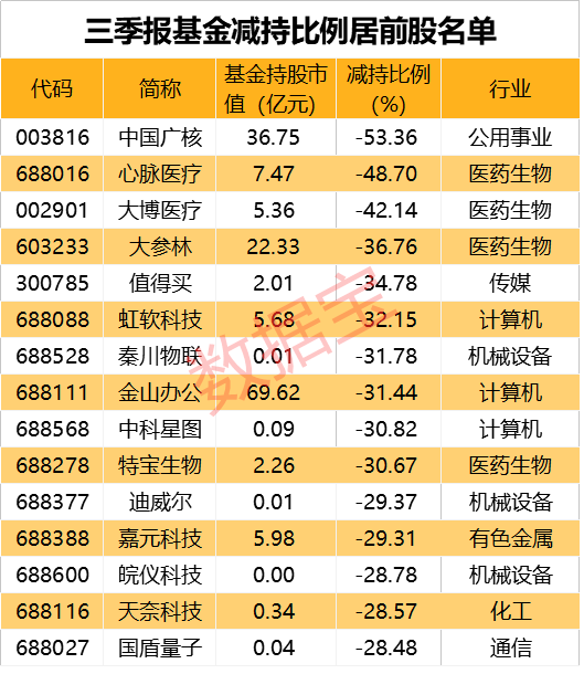 从减持市值占流通股比例来看,有166只股的减持比例超10%。其中有10只股的减持比例超过30%。中国广核的减持比例达到53.36%,第三季度中遭到基金减持3.98亿股。其他减持比例较高的还有心脉医疗、大博医疗、大叁林、值得买、金山办公等。