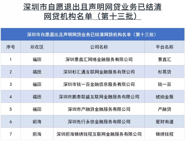 近日,深圳市互联网金融风险专项整治工作领导小组办公室发布第13批自愿退出且声明网贷业务已结清机构的名单。此次自愿清退的网贷平台具体包括景鑫汇、杉易贷、钱一百、琥珀金服、产融贷、爱财有道和锦绣钱程共7家。