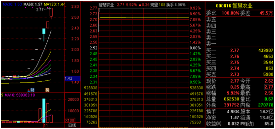 今日开盘,智慧农业直线拉升,仅仅一分钟就拉涨停,截至收盘,智慧农业收报2.77元/股,涨停板仍有43.99万手封单。