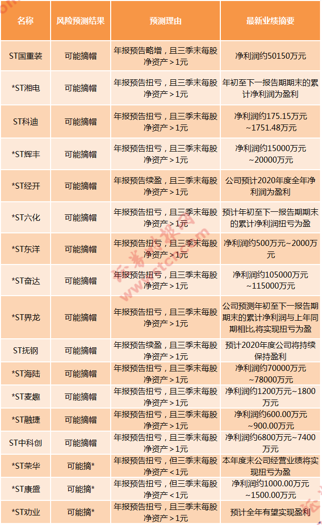 进入11月,随着三季报披露结束,上市公司年报业绩预告也逐渐浮出水面,存在摘帽预期的ST股将逐渐获得资金关注,还有哪些个股有望接力呢?