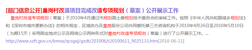 记者梳理发现, 早在2010年皇岗村改造项目就完成改造专项规划(草案)公开展示工作,此后一直无实质性进展,直到最近。