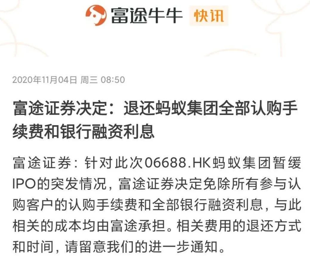 针对此次蚂蚁集团暂缓IPO的突发情况,富途证券决定免除所有参与认购客户的认购手续费和全部银行融资利息,与此相关的成本均由富途承担。其中,