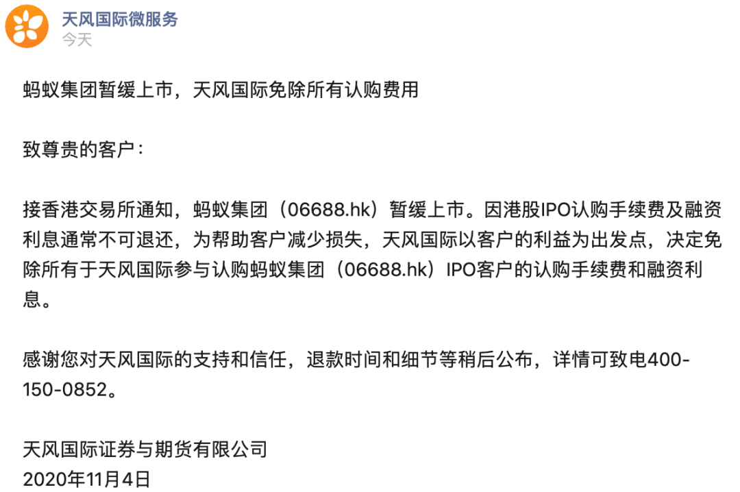 因港股IPO认购手续费及融资利息通常不可退还,为帮助客户减少损失,决定免除所有于天风国际参与认购蚂蚁集团IPO客户的认购手续费和融资利息,退款时间和细节等稍后公布。