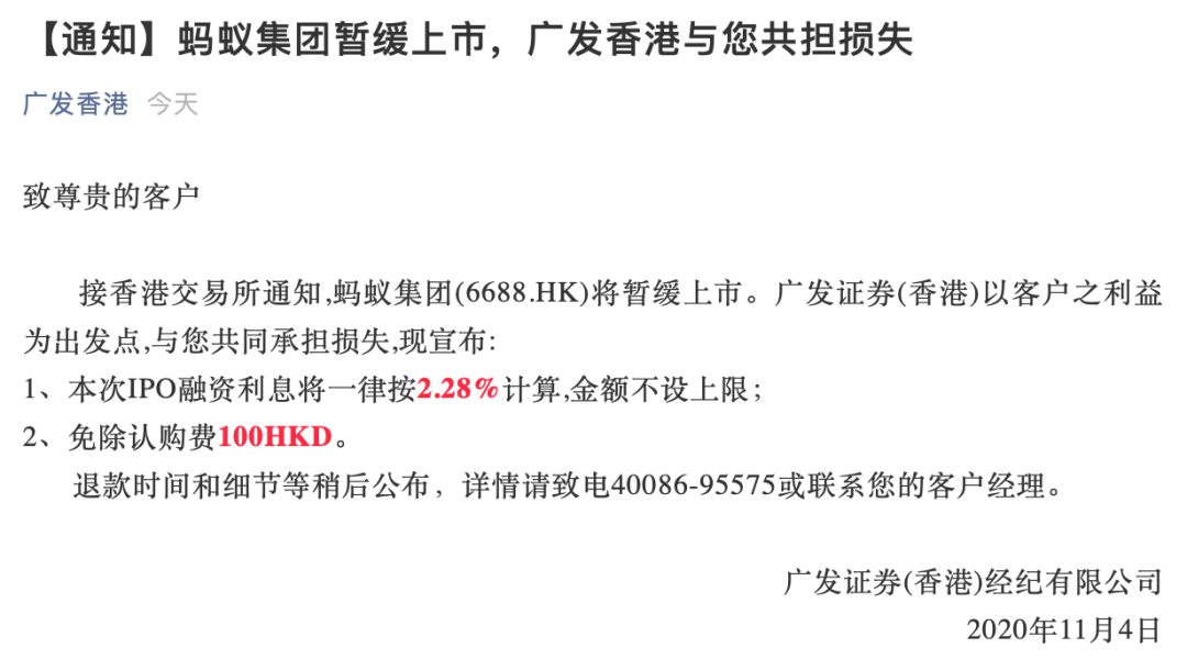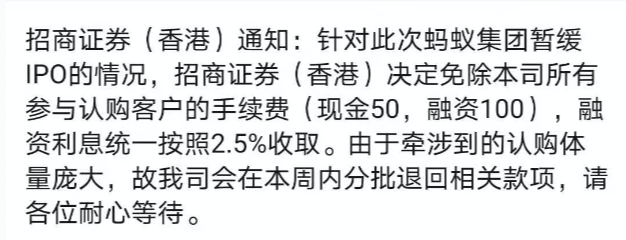 针对蚂蚁集团暂缓IPO情况,招商证券(香港)决定免除所有参与此次认购客户的50港元认购费、100港元融资手续费,融资利息统一按照2.5%收取。
