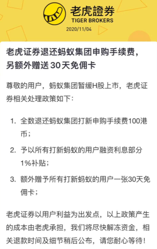 全数退还蚂蚁集团打新申购手续费100港币,予以所有打新蚂蚁的用户融资利息部分1%的补贴,并额外赠予一张30天免佣卡。上述政策成本由老虎证券承担,并将尽快解冻资金。