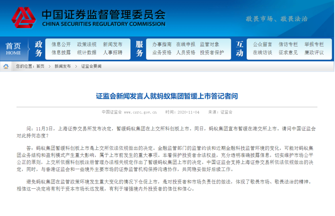 问:11月3日,上海证券交易所发布决定,暂缓蚂蚁集团在上交所科创板上市。同日,蚂蚁集团宣布暂缓在港交所上市。请问中国证监会对此持何态度?