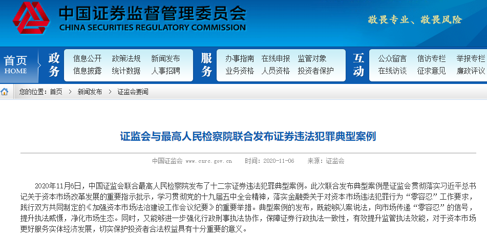 11月6日,最高检和证监会经过认真筛选、充分沟通,各自挑选出了6个刑事犯罪案例和6个行政违法案例作为典型案例予以发布。