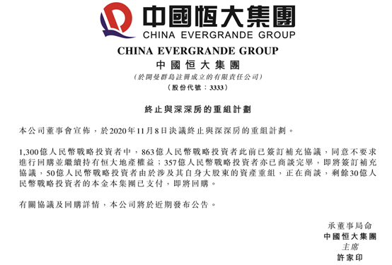 同时,中国恒大(3333.HK)也发布公告称,公司董事会宣布于2020年11月8日决议终止与深深房的重组计划。