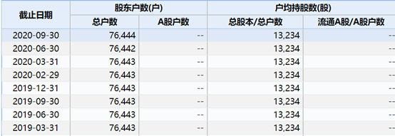 据Wind数据统计,截至2020年9月30日,深深房A仍有76444户股东,户均持股13234股。