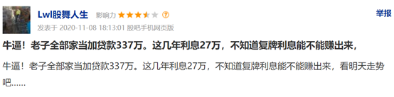 终止重组消息一出,便引起股吧中股民讨论。有股民愤然表示,用全部家当加贷款337万入股,这几年利息27万,“不知道复牌利息能不能赚出来”。