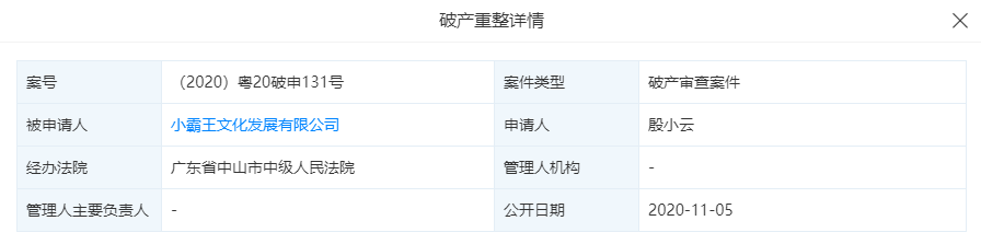 通过天眼查网站查询看到,小霸王文化发展有限公司已经被申请破产重整,经办法院广东省中山市中级人民法院,案号为(2020)粤20破申131号,申请人为殷小云。