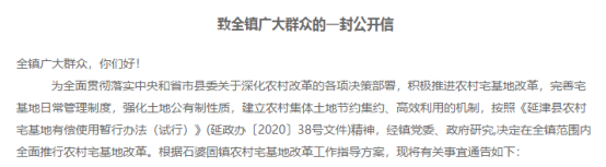 信中指出,决定在全镇范围内全面推行农村宅基地改革,是为了全面贯彻落实中央和省市县委关于深化农村改革的各项决策部署,积极推进农村宅基地改革,完善宅基地日常管理制度,强化土地公有制性质,建立农村集体土地节约集约、高效利用的机制。