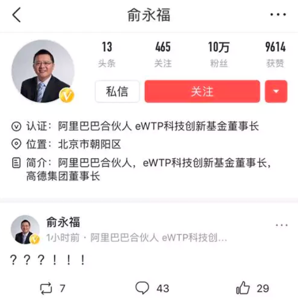 因此,当时“杨伟东被调查”事件曝出后,原阿里文娱董事长、阿里eWTP投资工作小组组长俞永福也用“???!!!”几个符号,疑似表达对此消息的震惊。
