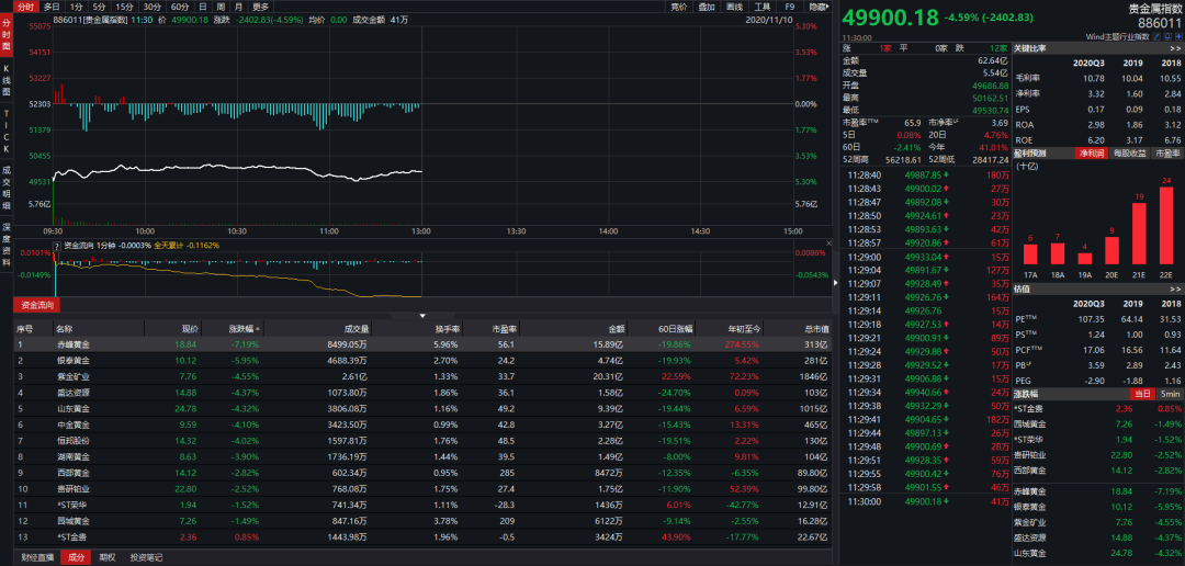 A股方面,今日贵金属指数报49900.18,指数下跌4.59%。指数成分股中,赤峰黄金下跌7.19%,银泰黄金下跌5.95%,紫金矿业下跌4.55%,盛达资源下跌4.37%,山东黄金下跌4.32%,中金黄金下跌4.10%,湖南黄金、西部黄金、园城黄金等均不同程度下跌。