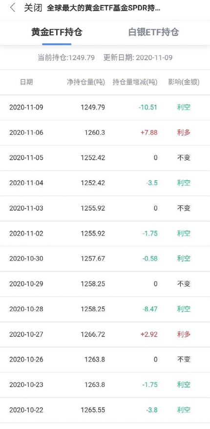 数据显示,截至周一(11月9日),全球最大黄金上市交易基金(ETF)SPDR Gold Trust黄金持仓量为40181967.15盎司或1249.79吨,较前一交易日减少337826.01盎司或10.51吨,幅度为0.83%。