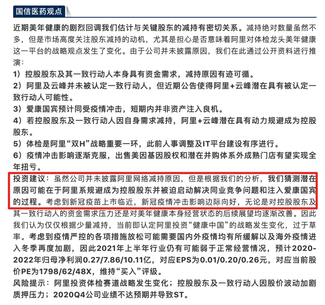 据了解,11月6日国信证券研究所医药行业小组发布研报,名为《美年健康:大跌事出有因,探寻阿里战略(重大事件快评)》,分析师在投资建议中称,“我们猜测潜在原因可能在于阿里系规避成为控股股东并被迫启动解决同业竞争问题和注入爱康国宾的过程。”