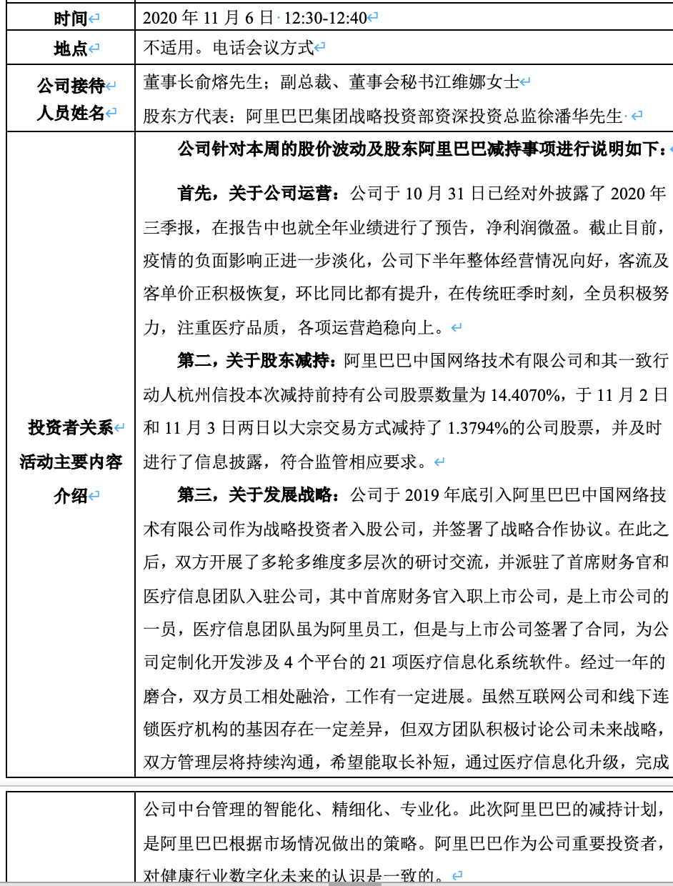 随后美年健康在11月6日召开投资者电话会议,针对股价波动及股东阿里巴巴减持事项进行说明。公司接待人员有董事长俞熔;副总裁、董事会秘书江维娜;股东方代表阿里巴巴集团战略投资部资深投资总监徐潘华。