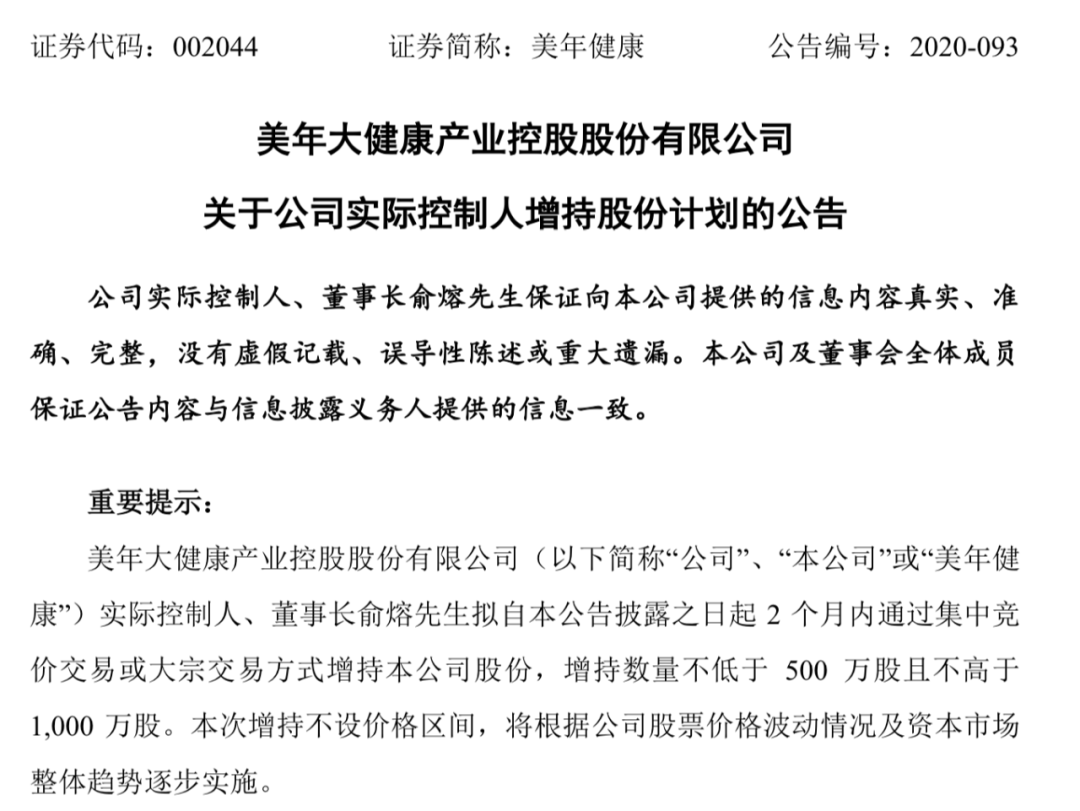 同日,美年健康还收到实际控制人俞熔增持的计划,增持旨在增强投资者信心。