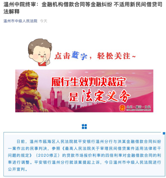在11月12日的公告中,温州中院二审判决认为,“本案系金融借款纠纷,根据新民间借贷司法解释第一条第二款的规定,经金融监管部门批准设立的从事贷款业务的金融机构及其分支机构,因发放贷款等相关金融业务引发的纠纷,不适用该司法解释。故一审判决将本案金融借款合同中约定的利息、复利和逾期利息参照上述司法解释的规定按一年期贷款市场报价利率四倍进行调整,属适用法律错误,应予纠正。”