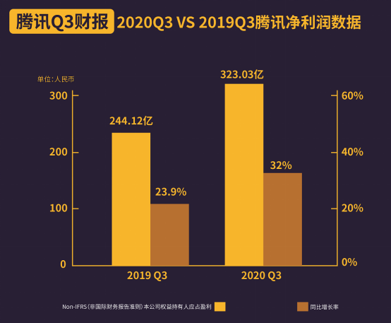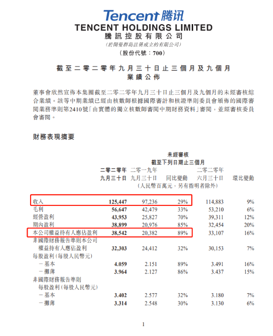腾讯Q3实现营收1254.47亿元,去年同期972.36亿元,同比增长29%;净利润385.42亿元,去年同期203.82亿元,同比增长89%;非国际财报准则下净利润323.03亿元,同比增长32%,业绩连续多个季度超出市场预期。