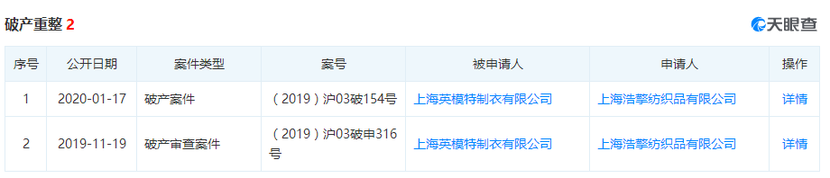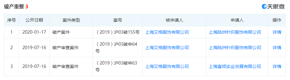 天眼查显示,上海艾格服饰有限公司已于去年被上海陆洲针织服饰有限公司申请破产重整,经办法院为上海市第三中级人民法院,案号(2019)沪03破155号。